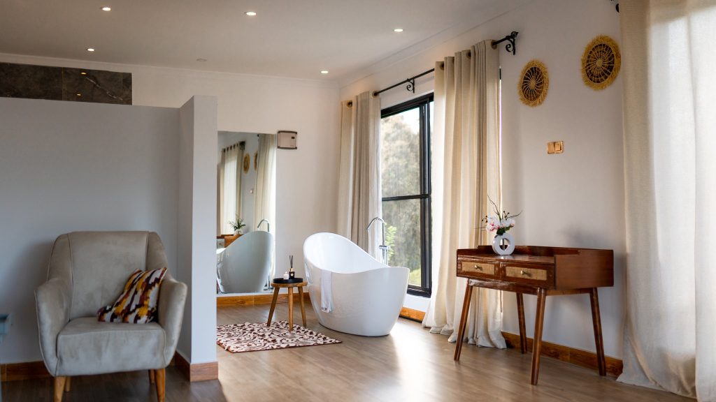 Unwind in the bathtub, a perfect place to soak after a day of exploration, or slip into the soft bathrobes and slippers provided for your comfort. The refrigerator and kettle add thoughtful convenience, allowing you to enjoy refreshments at your own pace.